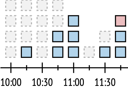 - At 11:00 all three remaining tokens were used, and one token was replenished at 11:15.