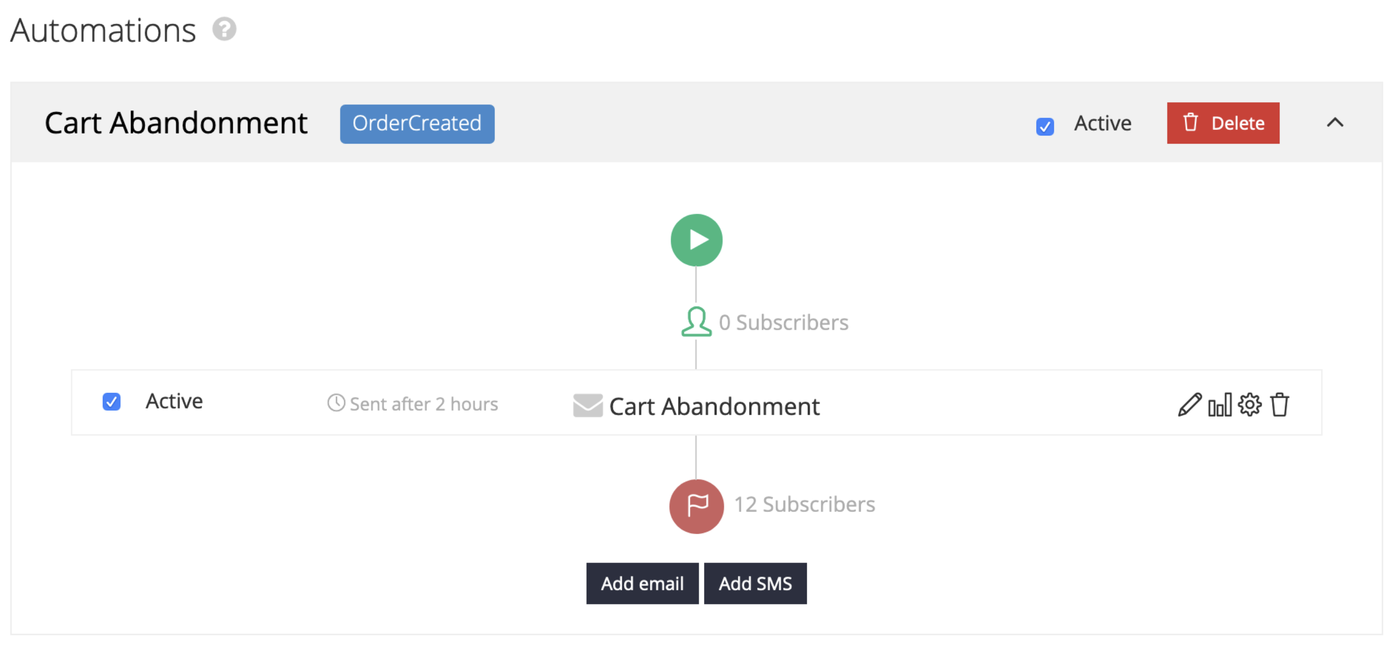 In your account in Rule, you need to add a simple automation which will trigger on the order tag orderCreated and start the timer until sending the CA e-mail. You can attach this automation to any e-mail or SMS template in Rule. You don't need to act on receiving orderCompleted tag, which is sent when the payment was successful and order was completed. Rule will automatically remove the orderCreated tag from the subscriber when that happens, so the CA e-mail countdown will be stopped. Finally, you should decide how quickly you will trigger the Cart Abandonment e-mails.
