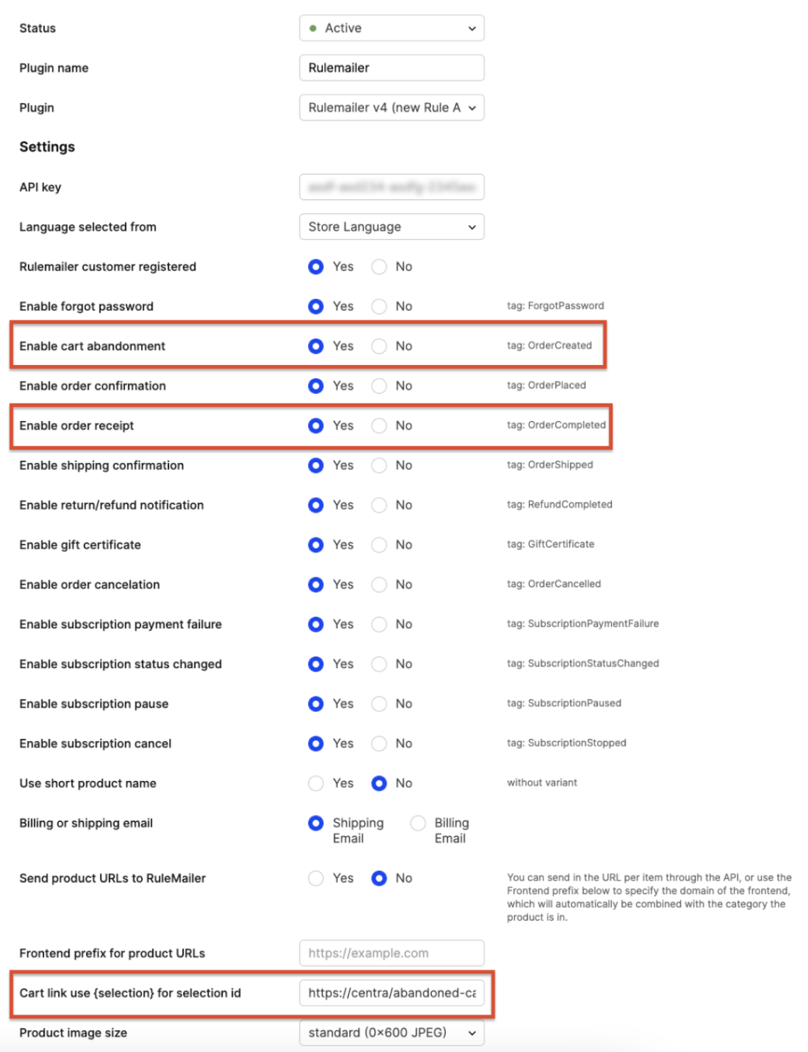 OrderCompleted): should be set to Yes, Cart link: should be set to the URL your webshop uses for cart abandonment, e.g.https://brand.my/cart/{selection}